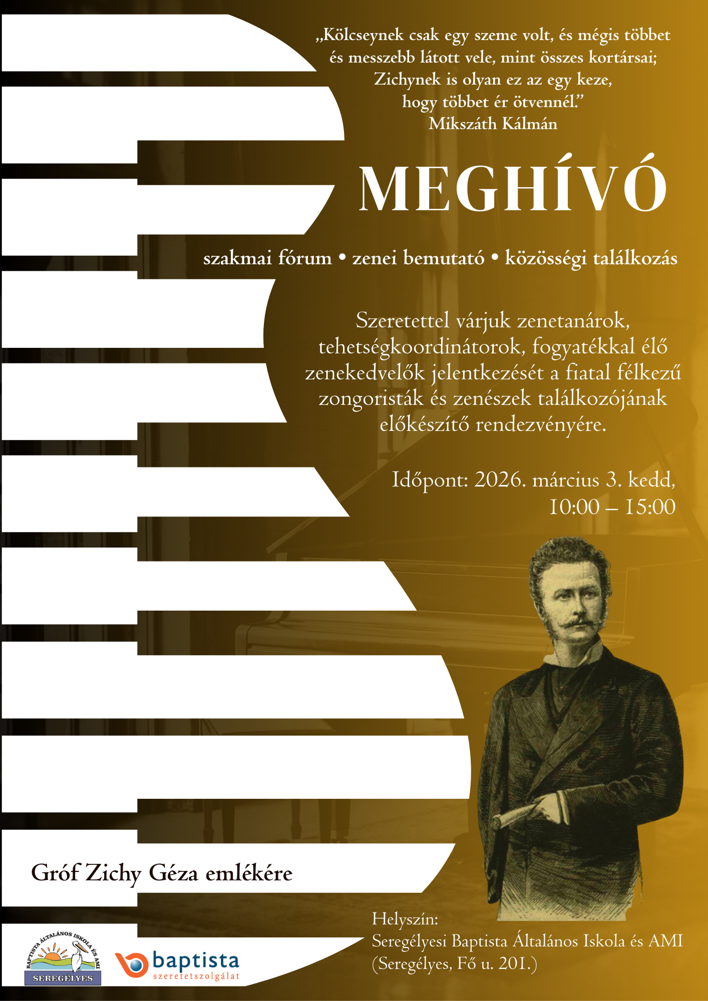 A Seregélyesi Baptista Álatlános Iskola és Alapfokú Művészeti Iskola 2026. március 3-án rendezi meg Félkezes zongoristák/zenészek találkozójának előkészítő rendezvényére, szakmai fórumra, zenei bemutatóra.